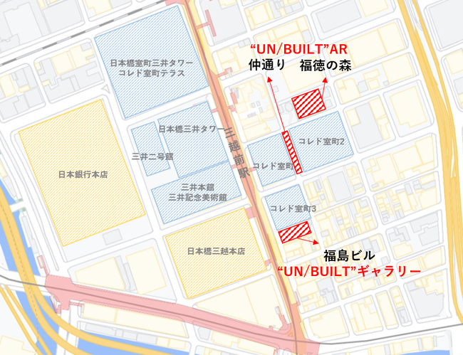 日本橋「福徳の森」、「仲通り」の2か所に公募アイデアを含むAR作品を展示し、“UN/BUILT”AR日本橋を開設。