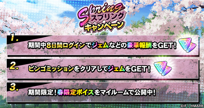 期間中、マイルームで春をテーマにした期間限定ボイスを聴くことができます。また、期間中にログインすると該当ボイスは「コレクション」内のそれぞれのキャラクターページでいつでも視聴することが可能になりますのでぜひアプリにアクセスしてみてください。