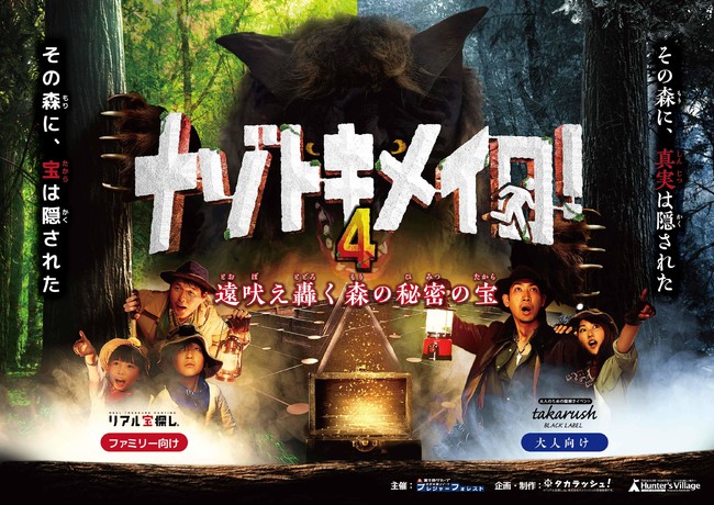 昨年夏に好評を博した、公演型の謎解きイベント「ナゾトキメイロ4~遠吠え轟く秘密の宝~」を4月16日(土)より再演いたします。ファミリー向け(リアル宝探し)と大人向け(BLACK LABEL)の2種類あり、フリーパスとセットになったお得な前売り券なども販売しております。