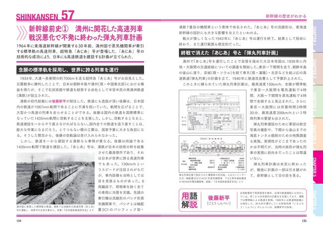1964年から2022年まで、半世紀以上にわたる新幹線の歴史を写真とともに解説。戦前に満州国で誕生した特急「あじあ」や、戦後復興から建設までの前史も紹介しています。