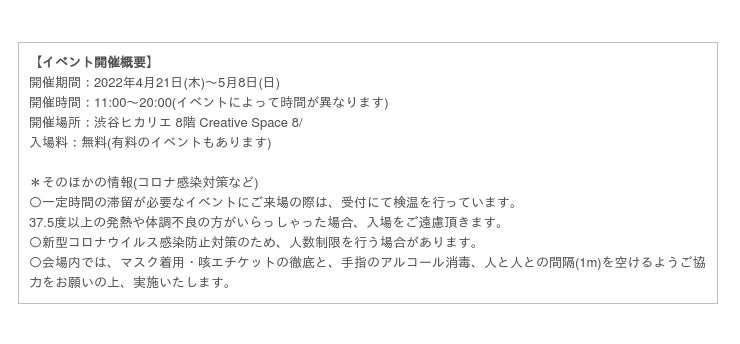 東急株式会社が運営する高層複合施設・渋谷ヒカリエ(住所:東京都渋谷区渋谷2-21-1)8階のクリエイティブスペース「8/(はち)(以下:「8/」)」は 、本日2022年4月21日(木)~5月8日(日)の期間で『SHIBUYA WANDERING CRAFT 2022(シブヤ ワンダリング クラフト)』を開催します。