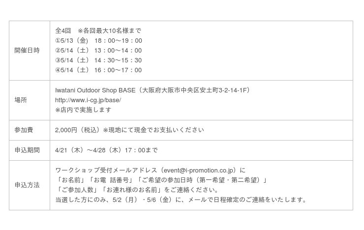 ワークショップに関するお問い合わせ:06-6264-0188(Iwatani Outdoor Shop BASE)