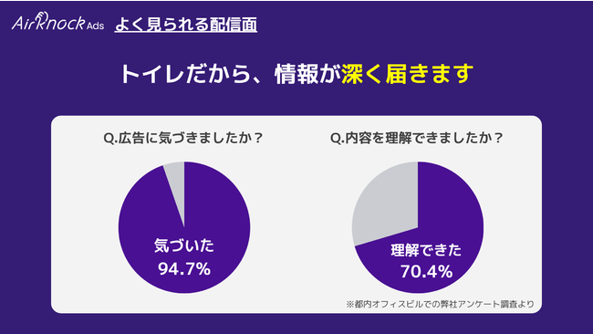 お手洗いは他のコンテンツが少ないため、利用者の視認性が高く集中してコンテンツを見やすいといった特徴があります。実証実験では、広告の認知度は約95%、配信したコンテンツの理解度は70%を超えるといった結果が出ています。また設置施設による閲覧ターゲットの属性や性別によるターゲティングも可能です