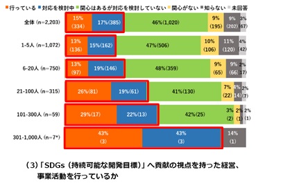 SDGsへの貢献の視点を持った経営、事業活動を「行っている」が15%、「対応を検討中」が17%と回答した事業者は約3割(33%)であり、従業員の規模が大きいほど前向きに取り組んでいることが確認できました