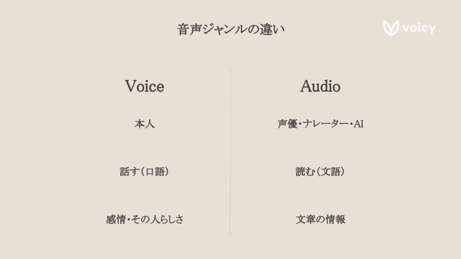 “音声×テクノロジーでワクワクする社会をつくる”をミッションに掲げるVoicyは、音声には“ボイス”と“オーディオ”の大きく2種類があると考えています。Voicyでは、パーソナリティによる「声のブログ」やニュースが声で聴ける「メディア放送」や、企業の声を伝える「オウンドメディア」などの音声放送を聴くことが可能です。それらは、発信者自らの声で届けることで、話し方や笑い声などから感情やその人らしさといった本人性が表れるもので、それは“ボイス”に当てはまります。