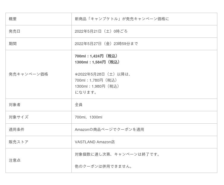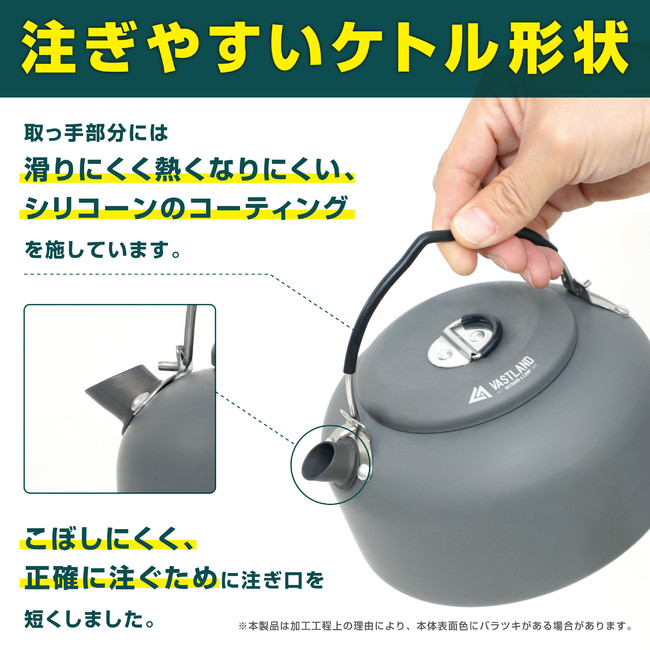 VASTLAND株式会社(本社:兵庫県姫路市/代表:田中悠貴)は、チタンやステンレス素材に比べ熱伝導率が高いアルミニウム素材を採用し、本体表面の硬質アルマイト加工により焦げつきにくく耐食性に優れた「キャンプケトル(700ml / 1300ml)」を2022年5月21日(土)にAmazon店で先行発売することを決定しました。またキャンプケトルの発売を記念して、Amazon店限定で「発売キャンペーン」を開催します。