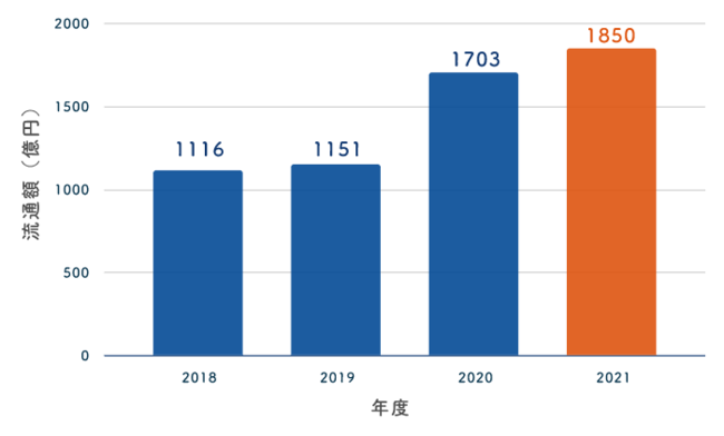 また、2021年度の流通総額は1850億円(前年度比108.95%)でした。