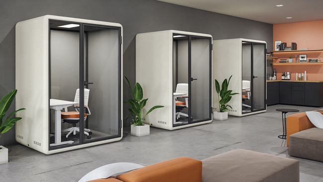 今回新設する関家具天神オフィスでは、より多くの方にKOLO(コロ)を使っていただき、体験していただくため、1人用Solo(ソロ)とワイドタイプのMidi(ミディ)、2~4名用のDuo(デュオ)、天井が低くて狭い、日本のオフィス向けに開発された、Milli(ミリ)のSitタイプとStandタイプの全5台を設置します。