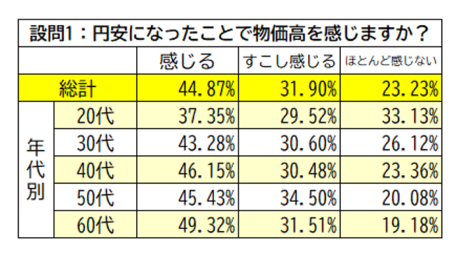 <設問1:円安になったことで物価高を感じますか?>の問いに対し、「感じる」と答えたのは44.87%、「少し感じる」は31.90%。一方、「ほとんど感じない」は23.23%でした。