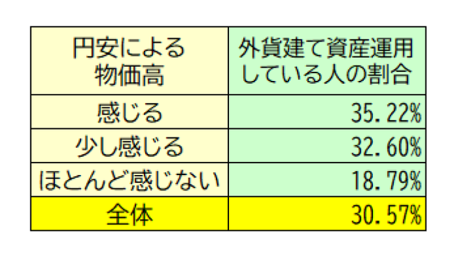 また、設問1、設問2で物価高や将来不安を「感じる」とした層ほど、設問3で外貨建ての資産運用をしていると答えた割合が多い傾向にありました。物価高や将来不安を肌で感じ、経済トレンドに敏感な人ほど、日本円にとどまらず外貨建ての資産運用も行っていると言えます。