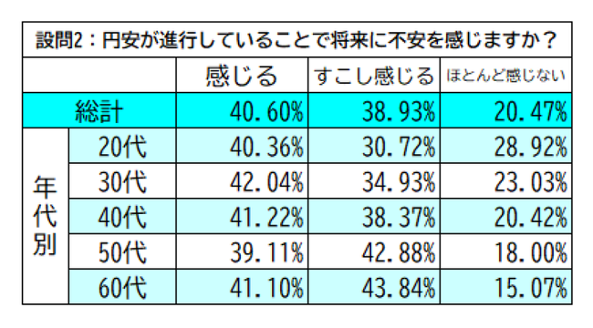 <設問2:円安が進行していることで将来に不安を感じますか?>では、「感じる」40.60%、「少し感じる」38.93%。「ほとんど感じない」は20.47%にとどまりました。