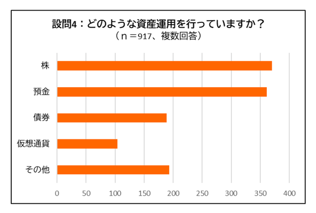 さらに、設問3で「少しだけ行っている」「半分程度行っている」「外貨建ての資産運用のみ行っている」と答えた917人を対象に<設問4:どのような資産運用を行っていますか?>と複数回答可で質問。最も多かったのが「外国株投資」370人で、次いで「外貨預金」361人が肉薄しました。以下「外国債券」189人、「仮想通貨」104人、「その他」193人でした。