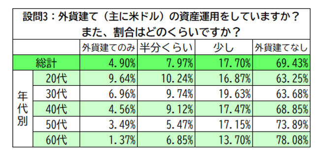 以下「少しだけ行っている」17.70%、「半分程度行っている」7.97%、「外貨建ての資産運用のみ行っている」4.90%-の順で、米ドルなどの外貨建ての資産運用をしている投資家は3割にとどりました。