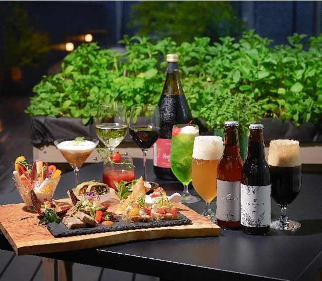 ドリンクと共にお楽しみいただけるお料理は、大和ポークのソーセージや豚のスペアリブ、ラムチョップに加え、地元で栽培された大和野菜を大胆にグリルしたメインプレートに加え、種類豊富なドリンクとのペアリングが楽しいアペタイザーメニュー、デザートを各種取り揃えております。肉料理やアペタイザープレートには「JWガーデン」で栽培したハーブを使用しており、摘みたてのハーブの香りと風味が食欲をそそります。