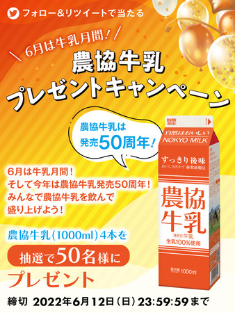 農協牛乳発売50周年を記念し、抽選で農協牛乳(1000ml)4本が50名様に当たるTwitterキャンペーンを実施いたします。50周年にちなみ、当選人数も50名様となっております。さらに、6月は牛乳月間でもあります。より多くの方に牛乳を飲んでいただけるよう、盛り上げてまいります。