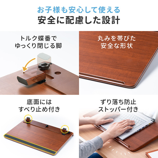天板下部にはタブレットや教科書、ノートなどが滑り落ちるのを防ぐストッパー付きです。トルク蝶番採用で、脚部分はゆっくりと開閉するので指はさみを予防し安全に使用できます。