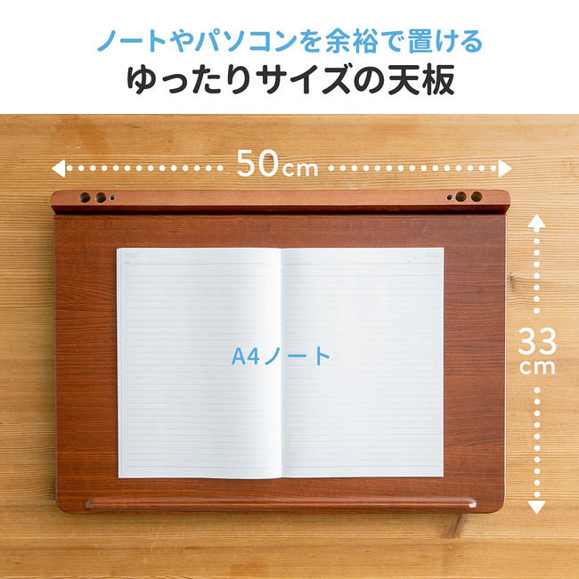 天板の横幅は約50cmあり、タブレットとA5ノートを横並びで置けるサイズに設計されています。