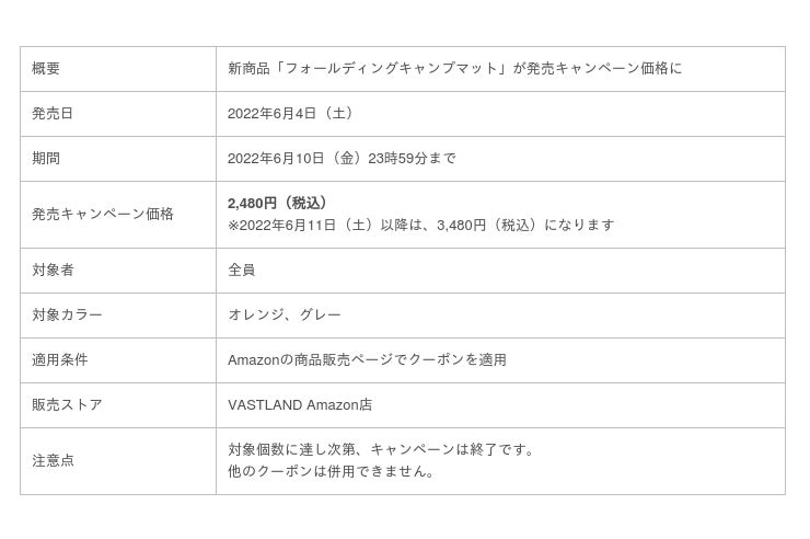 2022年6月3日(土)、VASTLAND株式会社(本社:兵庫県姫路市/代表:田中悠貴)は、こだわりのクッション性およびアルミ加工とウレタンパッドで快適な寝心地をサポートしてくれる「フォールディングキャンプマット」をAmazon店で先行発売しました。