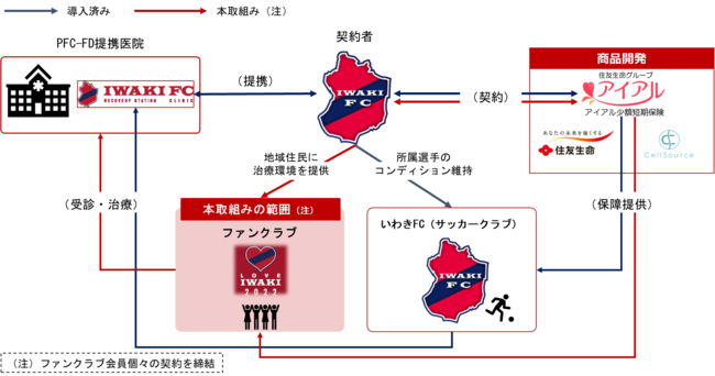 住友生命保険相互会社(取締役 代表執行役社長 高田 幸徳、以下「住友生命」)は、子会社のアイアル少額短期保険株式会社(代表取締役社長 安藤 克行、以下「アイアル少短」)、再生医療関連事業に取り組むセルソース株式会社(代表取締役社長CEO 裙本 理人、以下「セルソース」)と共同開発したひとの保険「バイオセラピー費用(運動器)保障条項」(ペットネーム:セルソースPFC-FD保険)を、スポーツを通じた地域における健康増進を目的として、日本プロサッカーリーグ(Jリーグ)に加盟するプロサッカークラブ・いわきFCのファンクラブ会員※1向けに提供を開始します。