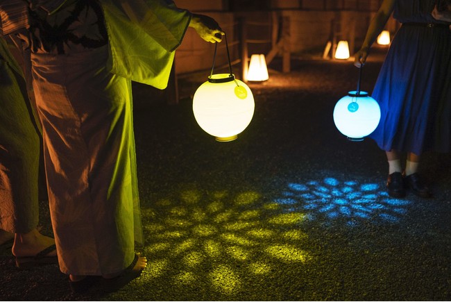 他グループとソーシャルディスタンスを自然と保てる「NAKEDディスタンス提灯(R)」。各地や企画にちなんで提灯から漏れる光の絵柄の変更も可能です。お客様に提灯を持っていただくことで、提灯から漏れる光の輪をそれぞれが保つと、ソーシャルディスタンスが保てます。提灯から漏れるかわいい光や、提灯自体をカラフルに展開し、夜でも可愛く写真が撮れるアイテムにもなっています。