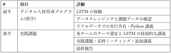 前半では、DeepLearningの勘所、チューニング方法を理解し、LSTMによる多変量の時系列解析手法の獲得し、後半では、机上の演習ではなく、業務に適用する視点でデータを扱い、解を導き出す訓練を行いました。