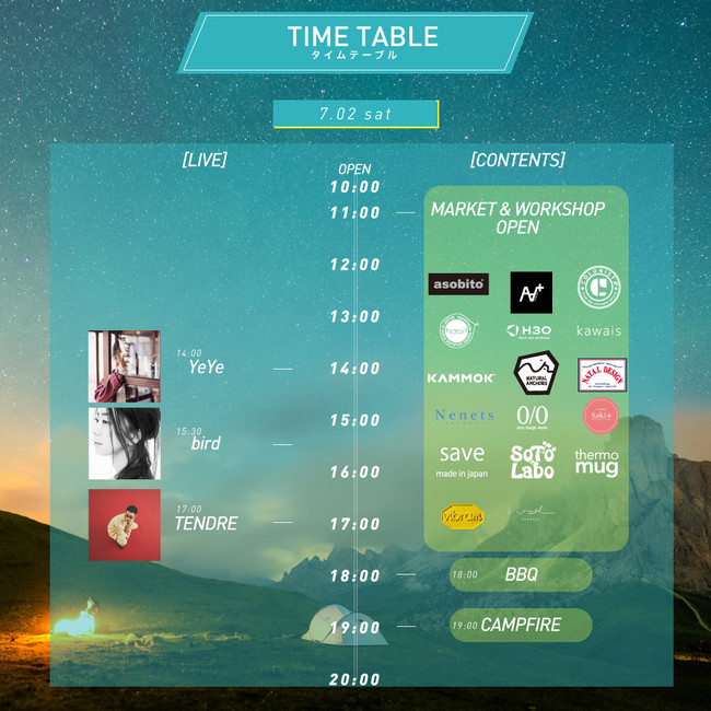 DANNER CAMP初日となる7月2日(土)には、YeYe、bird、TENDREによるライヴステージを開催。夜には参加者みんなで楽しめるBBQやキャンプファイヤーを実施。
