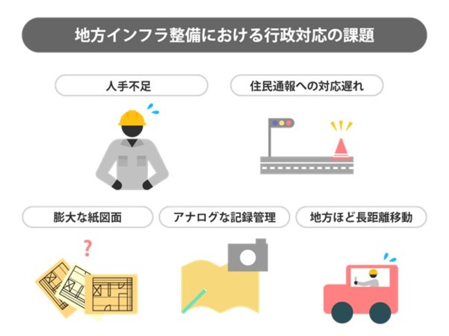 日本全国に1,718ある自治体では、業務のデジタル化の推進や、大都市圏以外においては特に人口の現象や少子高齢化が課題になっています。人口の減少等を背景とし、設備営繕を始めとした地域の安全向上の取り組みを効率よく行なうことに対し、改善の余地を多く抱えています。
