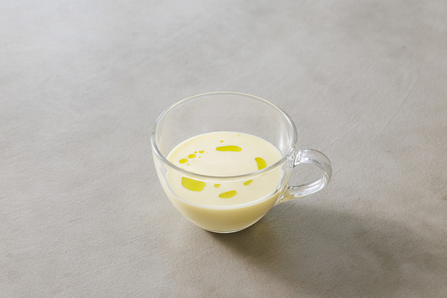 国産とうもろこしの甘みを丁寧に引き出した冷製スープ。ミントオイルの清涼感をアクセントにした爽やかな一杯。
