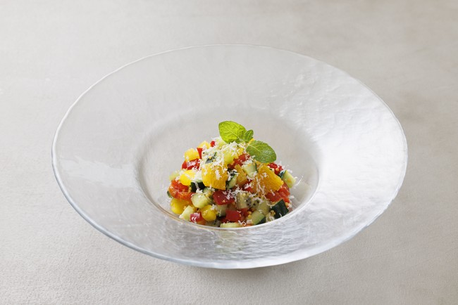 暑い季節の食欲を科学して生まれた、コース料理向けの独自の設計図。1品目は眠った食欲を目覚めさせる「目覚めの一皿」、2品目は食感と味のコントラストが楽しいサラダを通して食欲をさらに加速させる「高める一皿」、3品目はジューシー×スパイシーなメインディッシュで、感動を最高潮にする「味わう一皿」、そして4品目はどこまでも爽やかなデザートで、もたれずに満足感だけを残す「余韻の一皿」で構成されています。