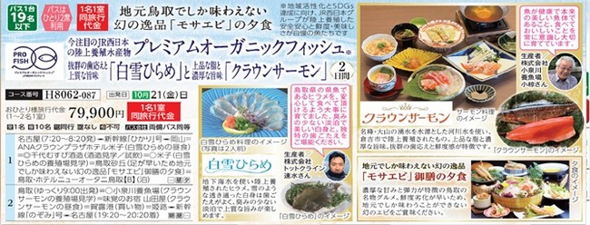 今回は、「PROFISH(プロフィッシュ)」のうち「お嬢サバ」や「白雪ひらめ」、「クラウンサーモン」の生産地がある鳥取県を目的地として、3つの魚をお召し上がり頂くことや養殖場を見学頂くことを、ご当地の他の食材や観光素材と組み合わせて企画いたしました。