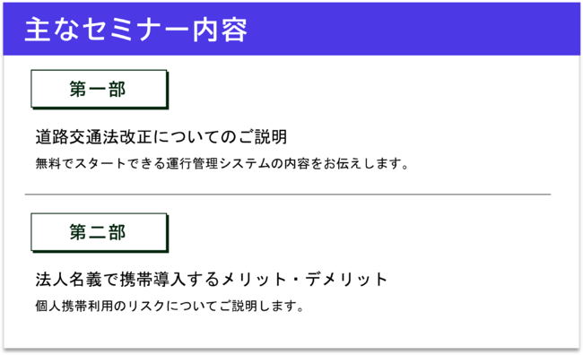 第一部では、道路交通法改正についてのご説明と合わせて無料でスタートできる運行管理システムの内容を、ご説明いたします。また第二部では、交通安全DXに必要となるスマートフォンについて、法人携帯導入のメリット・デメリットと個人携帯利用に関するリスクをお伝えいたします。