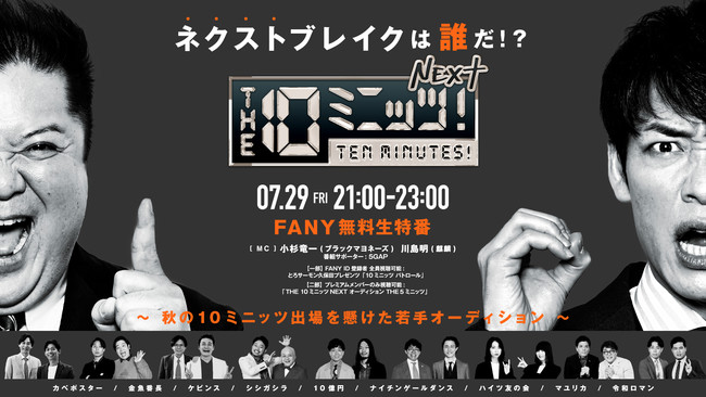 この度、吉本興業が運営する各種エンタメサービス「FANY(ファニー)」の無料生配信特番『THE 10ミニッツ!NEXT』の配信日が、7月29日(金)21時に決定いたしました。本番組は、2022年3月11日に大好評で幕を閉じた、生配信特番「THE 10ミニッツ」の第2弾(この秋開催予定)に向けたスピンオフ番組となります。