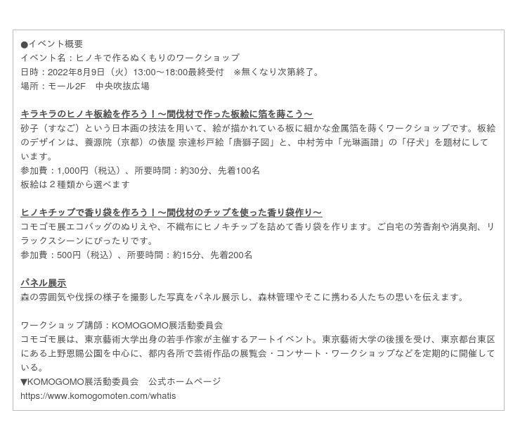 東京藝術大学の後援を受け、東京藝術大学出身若手アーティストの活躍の場をサポートし続ける「KOMOGOMO展活動委員会」協力のもと、静岡県裾野市にある「住友不動産の森」の間伐材を使用し、2種類のワークショップを開催いたします。