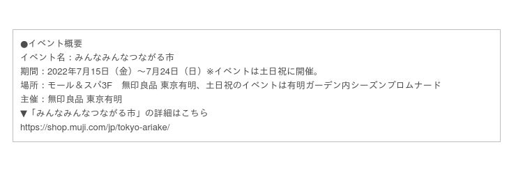 無印良品の「つながる市」とは、「ヒトとつながる、マチをつなげる」をコンセプトに、地域や地方の方々と一緒に特産品の販売やワークショップの開催などを行うマーケットです。無印良品 東京有明で2年ぶりとなる今回の「つながる市」には過去最大規模の40店が集まり、「みんなみんなつながる市」として開催されます。