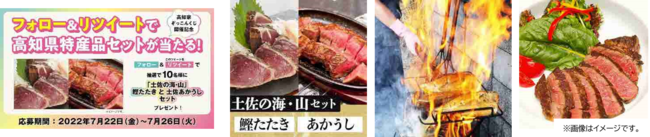 期間中、「高知家ぞっこんくじ」にご参加いただけなかった方をはじめ、全国どなたでもご参加いただけるTwitterキャンペーンを同時開催いたします。高知家の〇〇の公式Twitter(https://twitter.com/kochikeallstars)をフォローし、対象ツイートをリツイートすると「土佐の海・山セット 鰹たたきと土佐あかうし」が抽選で10名様に当たるキャンペーンを実施いたします。