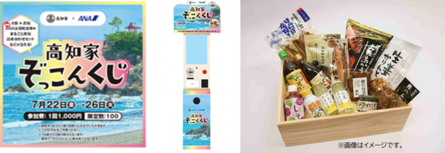 商品は、高知の魅力が詰まった特産品が手に入るだけでなく、特賞としてANA伊丹空港ー高知龍馬空港往復航空券をご用意!更に、くじの中には高知家のプロモーションキャラクターを務める島崎和歌子さんと三山ひろしさんのサイン入りグッズを限定で用意しております。