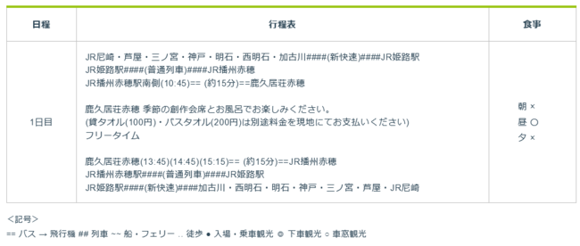 1.JR尼崎(8:25)→芦屋(8:35)→三ノ宮(8:45)→神戸(8:49)→明石(9:02)→西明石(9:06)→加古川(9:17)→JR姫路(9:28)(9:40)→JR播州赤穂(10:11)