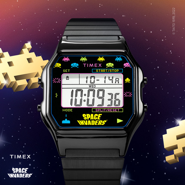 発売当初は白黒だった「スペースインベーダー」ゲームは後にカラー化され、国内のインベーダー人気が過熱しそのまま全米、そして世界のゲーム市場へと広まりました。70年代後期から爆発的人気で社会現象化した「スペースインベーダー」に合わせ、80年代風デザインが人気の『TIMEX 80(タイメックス 80)』をベースに、レトロさを取り入れながら現代的なデザインに仕上げました。