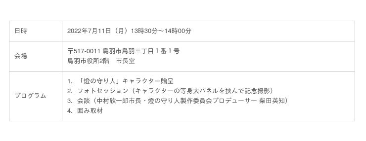 燈の守り人キャラクターを活用して、地域の灯台を歴史・文化資産として活用する機運をつくるため、キャラクター化の対象となる「菅島灯台」が立地している三重県鳥羽市の中村欣一郎市長を、「燈の守り人」製作委員会プロデューサーの柴田英知が2022年7月11日(月)に表敬訪問し、キャラクターの贈呈式を実施しました。