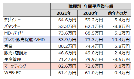 一方、「プレス・販売促進・VMD」の平均年間賞与は昨年比で−19.4万円と大きく減少しました。この背景には、採用ポジションの変化が挙げられます。2020年は、ECでの売上を拡大するため、PR戦略立案などのポジションで即戦力となる人材を少数採用する企業が多く、経験豊富な人材の登録が増加しました。