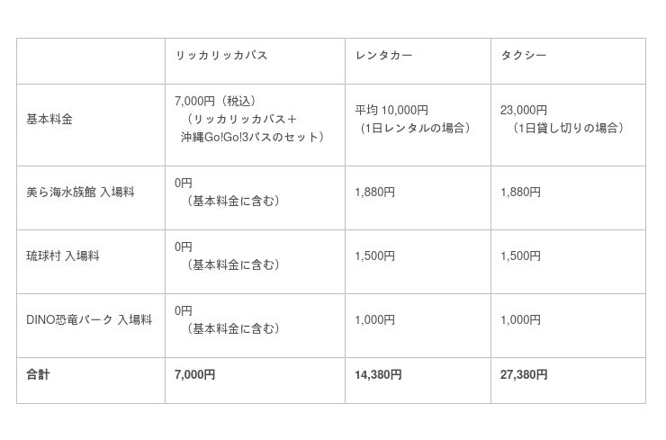 ▼リッカリッカバスとレンタカー、タクシーとの料金比較(一例) ※アクティビティジャパン調べ