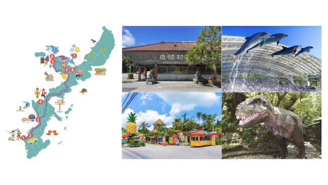 那覇空港 バス専用ターミナル→県庁前バスターミナル→アメリカンビレッジ→※琉球村→ハナサキマルシェ→美ら海水族館→古宇利島オーシャンタワー→ネオパーク→ナゴパイナップルパーク→名護お菓子御殿・恐竜パーク→美ら海水族館→ハナサキマルシェ→アメリカンビレッジ→県庁前バスターミナル