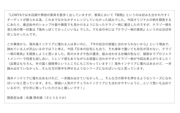 国内では希少な「テラゾー」柄が、今回LOWYAにて柔らかく温かみのあるオリジナル柄として登場しました。