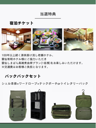 トロピックフィール公式Instagramへアクセス、フォローをし、対象キャンペーンページを「いいね」かつ「コメント」を記載することで応募となります。当選者は1名で、雲仙温泉・有明ホテルの宿泊代(1泊分、雲仙しまばら具雑煮プラン)とシェルバック本体とワードローブ、そしてポーチ、もしくはトイレタリーバックを付けたバックパックセットをプレゼントします。キャンペーン期間は、2022年8月18日(木)11時から8月31日(水)23時59分までとし、当選者には、直接DMで案内します。