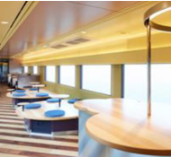 4号車はフリースペースが設けられた車両で、「遊星」の愛称が付けられています。自由に過ごせるようにテーブルや着席スペースが複数配置されています。出入口付近には車内イベント等、多用途に使用可能な雲形ハイカウンターを設けています。販売カウンターやスタンドバーとしても利用が可能で、お客様が自由にお使い頂ける設備です。