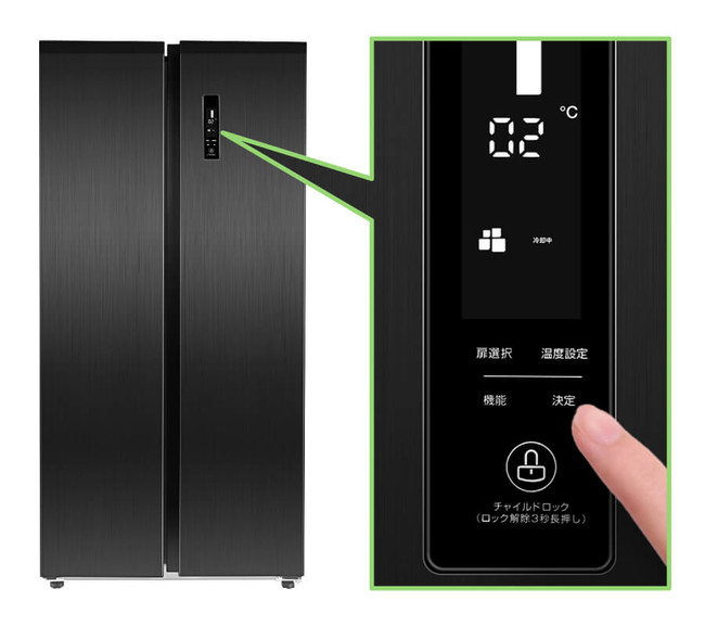 本体外側にコントロールパネルが付いており、ドアを閉じたまま全体の温度設定やモードの切り替えができます。ドアを開けたり、食材を移動させたりせずに冷蔵庫・冷凍室の温度をそれぞれ操作できるため便利です。