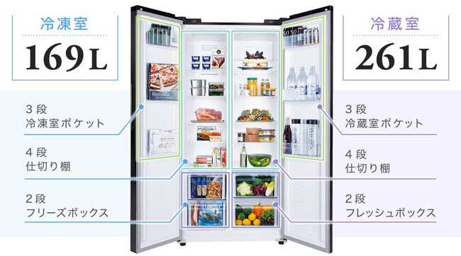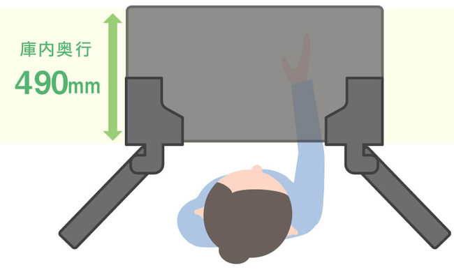 庫内の奥行きは約50cmと薄型のため、奥まで手が届きやすく食材が取り出しやすい仕様です。さらに省スペースで設置できるため、キッチンを広々と使いたい方や、食器棚やシンクなど他の家具との並びを綺麗に揃えたい方におすすめです。