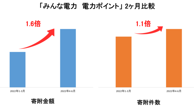 「電気代の節約」が注目される中、「【みんな電力】電力ポイント」への寄附金額、件数共に、2ヶ月間の比較でも伸びており、ふるさと納税を活用して電気代の支払いを行なっている人が増えています。