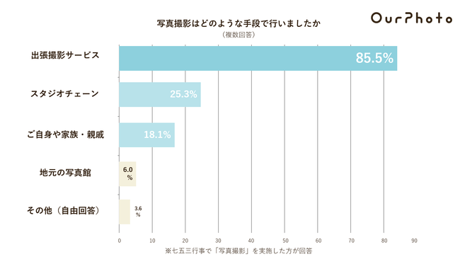 七五三での写真撮影手段として、出張撮影サービスが多く選ばれており、ニーズが高いことがわかる。