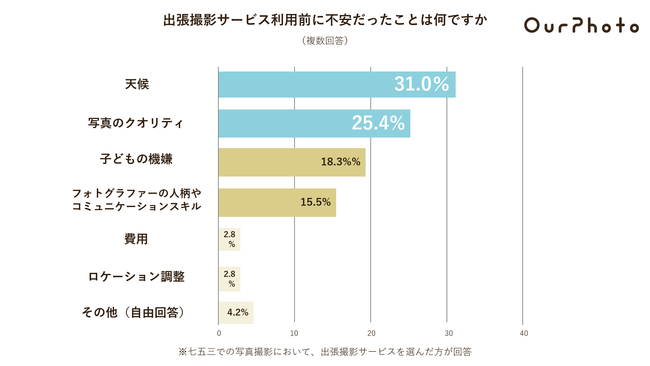 屋外の撮影で、季節感を感じられるのが魅力の出張撮影サービスだが、一方で撮影日の天候が不安要素の1位にあがった。また、フォトグラファーを選択できるのも出張撮影サービスの魅力であるものの、「写真のクオリティ」や「フォトグラファーのコミュニケーションスキル」などフォトグラファーに関する不安要素も上位にあがった。